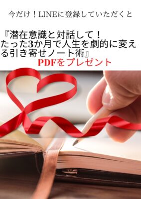 ①「潜在意識と会話して、たった3か月で人生を劇的に変えるノート術」書き方PDFを無料でプレゼントしております。